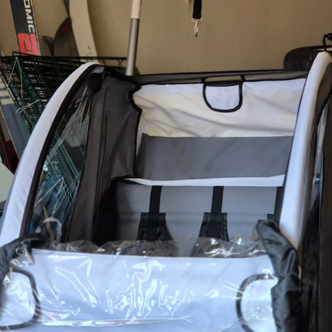 North cykelvagn för två barn i blå färg. Vagnen har stabil aluminiumram, två hjul bak och dragarm framtill för montering på cykel. Invändigt finns sittplatser med sele och remmar för fastspänning av barnen. Sidor och front har fönster i plast samt tygöverdrag som skydd mot väder. Passar för transport av barn eller packning bakom cykel. Felfri och allt fungerande i originalskick.