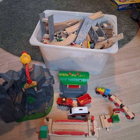 BRIO tågbana träleksaker set. Innehåller flera fordon som tåg, bilar och bussar, olika figurer, broar, byggnader, bergdelar, kranar samt tillbehör i trä och plast. Delarna kan kombineras till olika banor och miljöer och passar för lek med BRIOs klassiska trätågssystem.