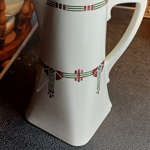 Stor blåvit keramikkanna med lock och segelbåtsmotiv på sidorna. Kannan är fyrkantig nedtill med rund öppning upptill och avtagbart lock. Dekoren består av blå målade ramar, bladornament och ett segelfartyg i oval medaljong på varje sida. Passar som dekorativ inredningsdetalj eller som större kanna/behållare. Höjden framgår av bilden med måttstock för ungefärlig storlek.