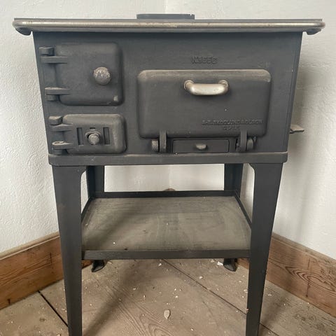 Vedspis i gjutjärn i inbyggnadsmodell. Spisen har flera kokplattor på ovansidan och ugnslucka framtill samt separata luckor för drag och askuttag. Passar för installation i kök eller stuga där man önskar vedeldad matlagning och uppvärmning. Färg i grå metallisk ton. Renovera eller använd till reservdelar.
