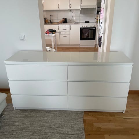 vit, 6 lådor, med glasskiva. Fräsch med ett par märken på ena kortsidan. Hämtas, umeå, öst på stan, 3 trappor utan hiss.