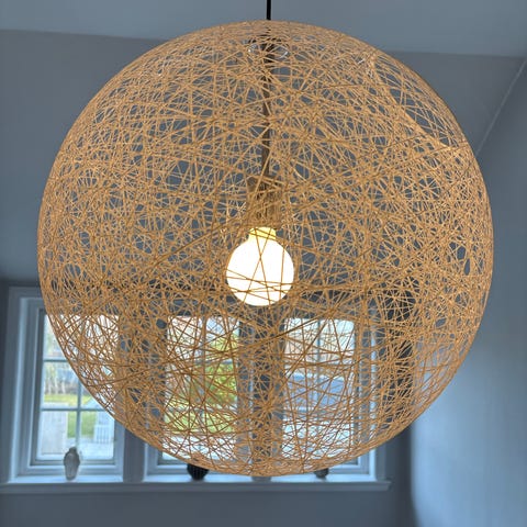 Skärmen har en geometrisk form med tätt lindade snören runt en stomme som ger ett genomsläppligt ljus. Passar som allmänbelysning i exempelvis vardagsrum, sovrum eller kök.