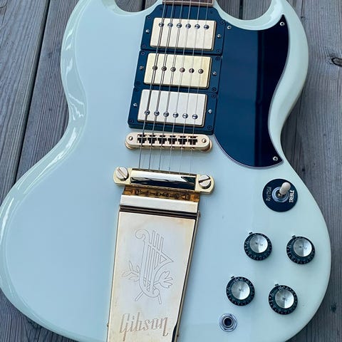 Säljer en Gibson SG Standard från 2011 i färgen Ebony Black. Gitarren är i princip i nyskick bortsett från en minimal färgavflagning vid elektronikluckan (se bild). Inköpt 2012 på musikcenter i Falun, och det var nog också året den senast blev spelad på, iallafall i någon större utsträckning. Den har sedan dess alltid förvarats i sitt hardcase, inomhus, med silicagel i caset.