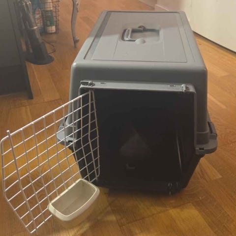 Stor transportbur med handtag och förvarning. Klistermärken på den så man kan använda om man ska flyga med djur eller dylikt.