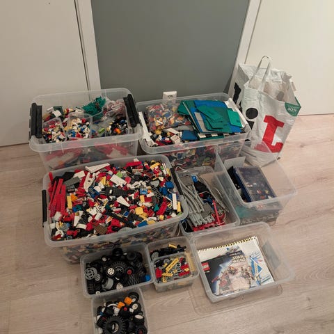 Lego blandade klossar och fordon. Innehåller 23 påsar med byggmodeller och två tekniklegomodeller och 3 lådor med olika lösa legobitar i blandade färger samt mindre fordon och figurer. Passar för fritt byggande, komplettering av befintliga legosamlingar eller reservdelar till olika modeller. Exakta set och antal bitar framgår inte av bilderna.