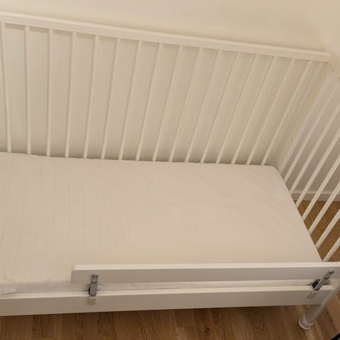 Spjälsäng i gott skick som går att montera i två olika höjder. När barnet blir större går en sida att montera av. Madrassen heter Vyssa och är en bättre variant än standard.