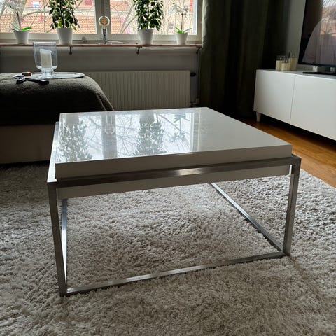 Bordet passar fint i ett modernt vardagsrum och den ljusa glasskivan ger ett luftigt och elegant intryck.