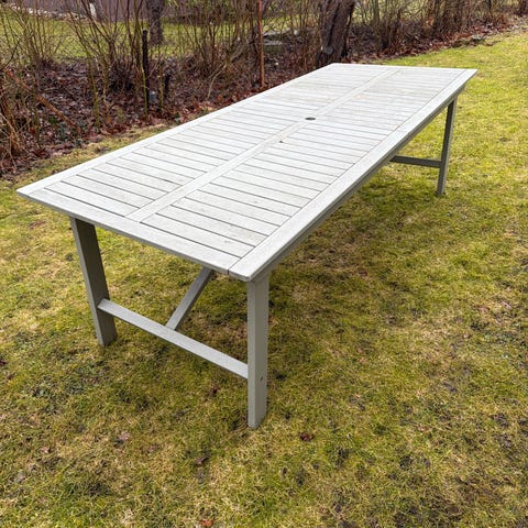 Rektangulärt trädgårdsbord samt bänk i aluminium/ metall.