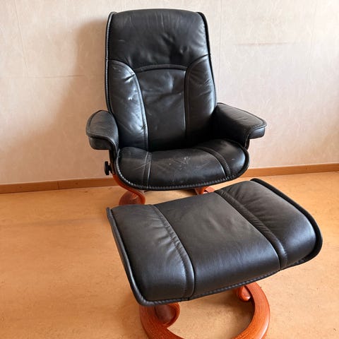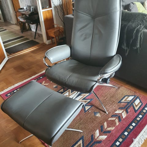 Ekornes Stressless fåtölj i svart läder med tillhörande fotpall.