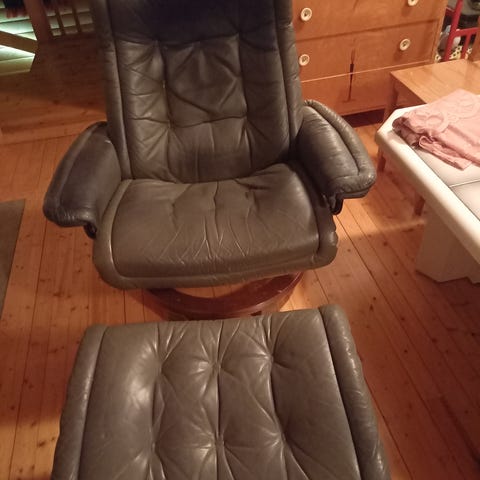Ekornes Stressless fåtölj i svart läder med tillhörande fotpall. Känd norsk kvalitet och ergonomisk design. Fåtöljen ger bra stöd för rygg och nacke och ryggstödet går att luta bakåt/framåt steglöst. Fåtöljen går att vrida på sin roterande bas. Stommen till både fåtölj och fotpall är gjord av böjt trä. Fåtöljen är både skön och rymlig.