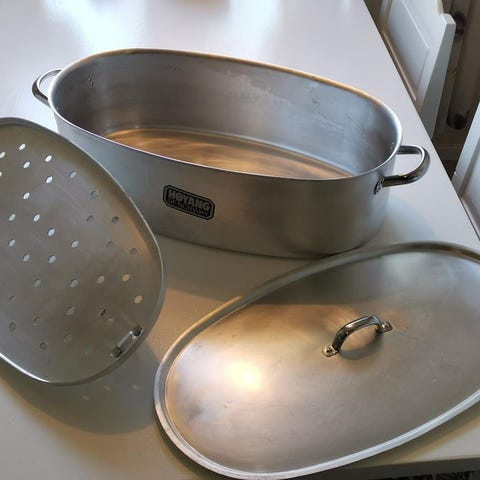 IKEA fiskgryta i rostfritt stål. Långsmal gryta med lock och insats med hål för ångkokning eller skonsam tillagning av fisk och andra livsmedel. Passar för användning på spis och är utformad för att rymma hela fiskar eller andra avlånga råvaror. Längd 45 cm Höjd 10 cm Bredd 16 cm. Säljes endast i Västervik med omnejd. Skickas ej