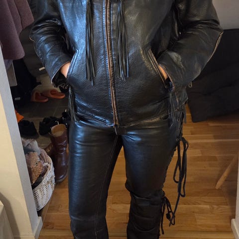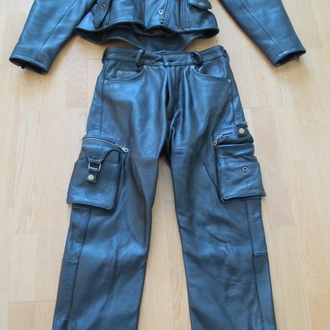 Till stället ingår även ett par svarta mc-handskar i läder med förstärkningar över knogarna samt justerbar stängning vid handleden. Storlek S.