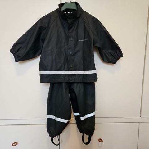 Mörkblå regnbyxor i galon från Polarn och Pyret i bra skick. Tvättade parfymfritt. Ett kvalitetsplagg! Lätt slitna hällor, men det går enkelt att köpa nya i valfri barnklädesaffär.