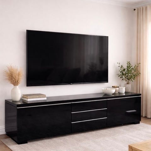 Den har rymlig förvaring med två flyttbara hyllplan så att du enkelt kan anpassa utrymmet efter dina behov. På baksidan finns två öppningar för smidig kabeldragning till TV och annan elektronik.