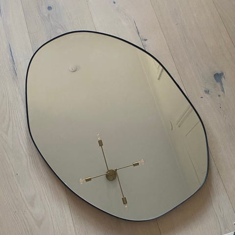 Speglar med metallföremål säljes. Den avlånga mäter: Höjd 132 cm Bredd 42 cm. Den ovala: Höjd 24 cm Bredd 70 cm. 700:- för båda.