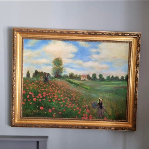 Tavla med stadsmotiv föreställande en kanal med bro, byggnader och en cykel i förgrunden. Målningen har varma och kalla färger i en blandning av blått, rött, gult och grönt. Tavlan är inramad i en mörk, rektangulär ram och är avsedd att hängas på vägg, lämplig som väggdekoration i exempelvis vardagsrum, hall eller kontor.