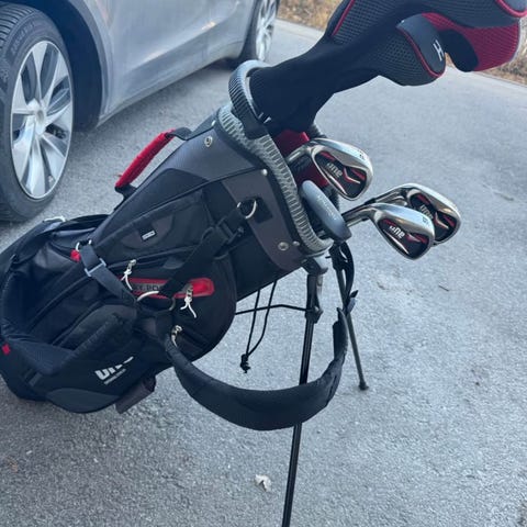 Golfset med golfklubbor och golfbag i svart och röd färg. Setet innehåller flera järnklubbor samt headcovers för träklubbor. Golfbagen har flera fack för förvaring av bollar, peggar och annan utrustning samt bärhandtag. Passar för allmänt spel på golfbanan.