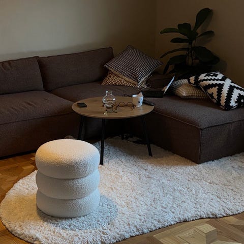 Stilrent soffbord från IKEA, modell Strind. Bordet har runda glasskivor och en stabil metallram som ger ett luftigt och modernt intryck i vardagsrummet.
