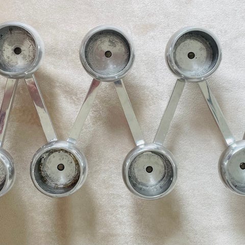 Klong ljusstake i silverfärgad metall. Ljusstaken har flera sammanlänkade ljushållare i ett geometriskt mönster och är avsedd för små ljus eller värmeljus. Passar som bordsdekoration eller inredningsdetalj i olika rum.