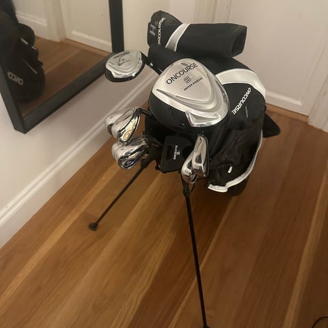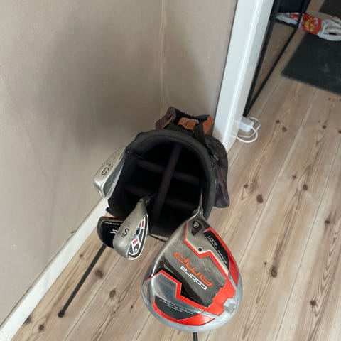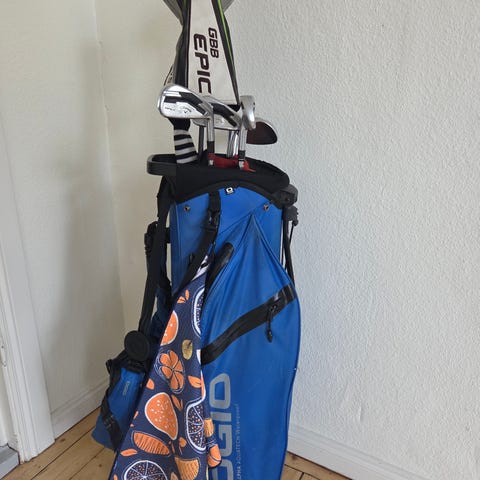 Medföljande bärbag har benstativ, flera fack för klubbor och sidofickor för tillbehör. Setet passar spelare som söker ett komplett grundset med klubbor och väska för golfspel.