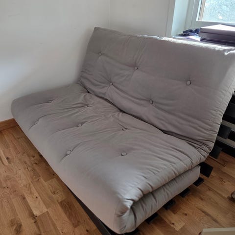 Är i väldigt bra skick utan direkta blessyrer. Köptes för 6000kr. Använts som extrasäng väldigt få ggr, men en del som soffa i extra rum på övervåningen. Avsevärt mycket högre kvalitét än den Ikea variant som finns att köpa för 3000kr.