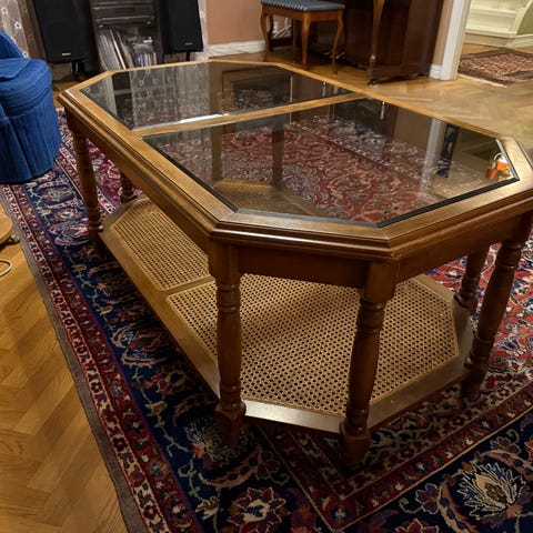 Två vita soffbord med glasskiva. Bra skick. Det större, 8-kantigt: bredd 130cm, djup 75 cm, höjd 50 cm. Det mindre, 6-kantigt: bredd/djup 60 - 69 cm, höjd 50 cm.