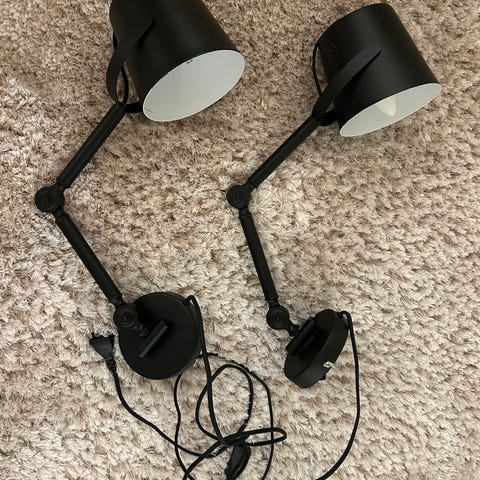 Modern bords/sänglampa med svängarm och vita linneskärmar. Inköpta på Mio.
