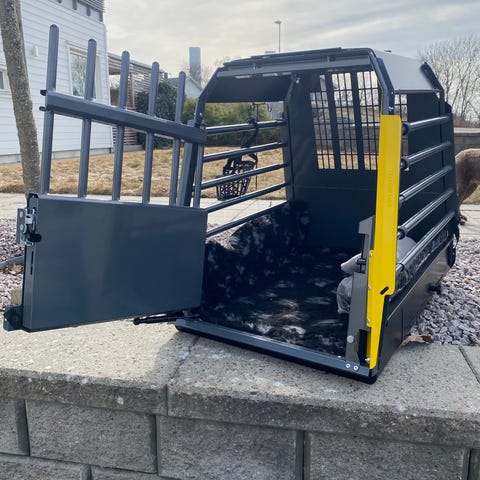 Hundburen är designad för att passa perfekt i en Volvo v70 eller xc70. Vi har haft vår Flat Coated Retriever i buren så den är anpassad för större hundar. Bredden på buren är 49,5 cm.
