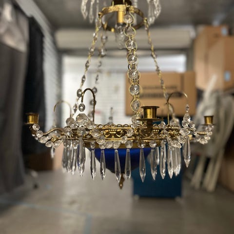 Design Bertil Vallien Ljuskrona, stomme i guldfärgat smide c:a 40 cm i diameter höjd 22 cm med tjocka glashängen. Driver effektivt ut fukt i inglasade uterum på exempelvis en balkong eller på sommarstället. Ger även en välkomnande varm känsla som få vanliga taklampor gör och har man den på lantstället så ger den både ljus och värme vid eventuella elavbrott Om någon saknar bil och är nöjd efter att ha sett ljuskronan ( visas i trapphuset i entrén till där jag bor) så kan jag till självkostnadspris transportera den till köparens bostadsadress men endast inom Stockholms innerstad