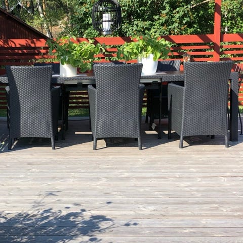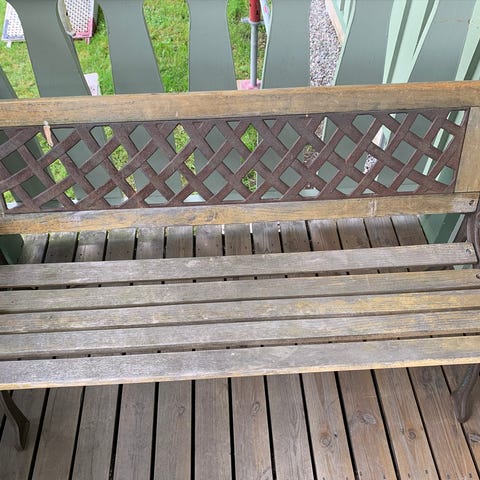 Trädgårdsbänk i trä och metall. Sitsen består av träslanor i naturfärg och ryggen har ett dekorativt rutmönster i mörk metall. Ben och armstöd är i svart metall. Passar för utomhusbruk på altan, veranda eller i trädgård. Bänken är avsedd för sittplatser för flera personer.