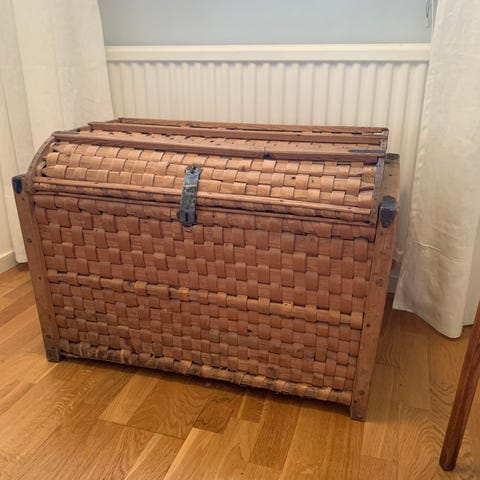 Kista med gångjärnsförsett lock. Flätad trädesign på sidor och lock, naturfärgad yta. Invändigt släta träbrädor som ger ett rymligt förvaringsutrymme. Lämplig som förvaring i exempelvis hall, sovrum eller vardagsrum. 75x45cm höjd 55cm.