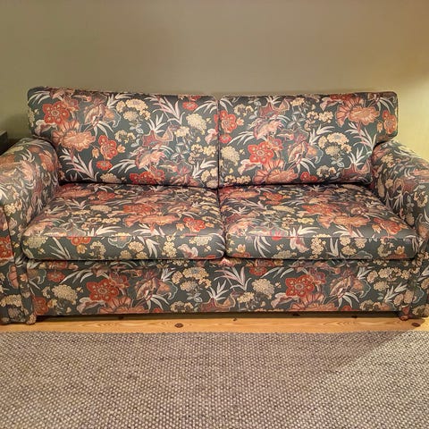 Djup 88, bredd 200, höjd rygg 75cm. Underbädd 77×177 cm. Soffan har använts mycket begränsat och är i mycket bra skick . Hämtas av köparen.