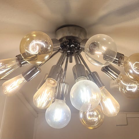 Taklampa i svart metall med flera armar och socklar för glödlampor. Lampan hängs från taket med sladd och takfäste. Passar som allmänbelysning i exempelvis vardagsrum, matplats eller större rum där många ljuskällor önskas. Glödlampor på bilderna illustrerar hur lampan kan se ut i bruk.