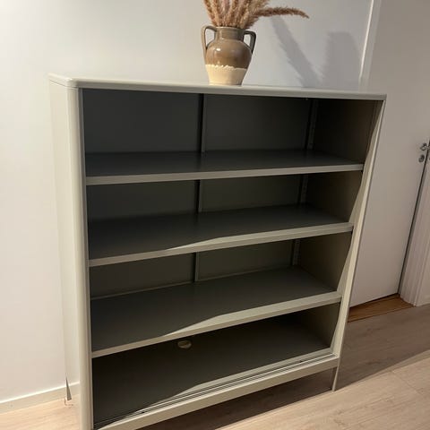 2 stycken vitrinskåp med flera glas hyllplan och nederdel med lådor. Skåpet är i beige färg med handtag i metall på lådorna. Passar för förvaring och exponering av exempelvis porslin, glas eller prydnadssaker i vardagsrum eller matsal. Fristående modell som kan placeras intill tv-bänk eller annan förvaringsmöbel. Säljs för 1000kr styck.