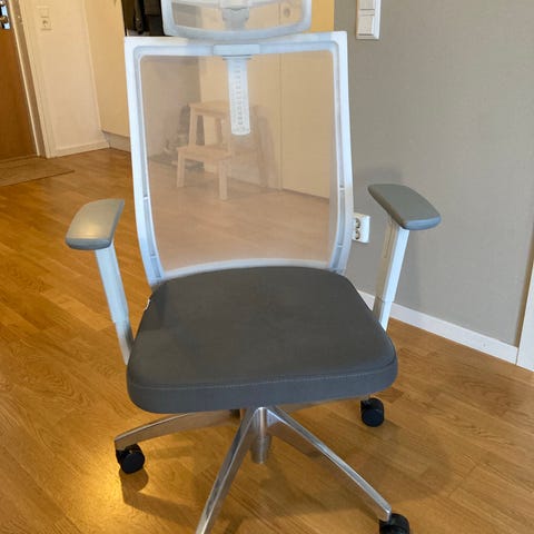 Kontorsstol i vit färg med stoppad sits och nätklädd rygg. Stolen har armstöd, kryssfot med hjul och justerbar sitthöjd. Passar för användning vid skrivbord eller arbetsplats i hem eller kontor.
