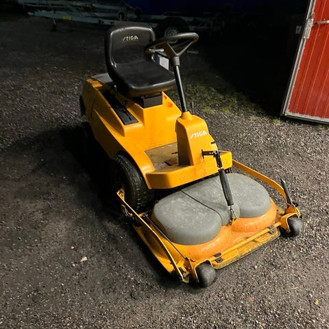 Stiga åkgräsklippare utrustad med frontmonterat klippaggregat och Briggs & Stratton bensinmotor. Maskinen har förarsäte med ryggstöd och rattstyrning. Klippaggregatet är frontmonterat för god överblick vid klippning.