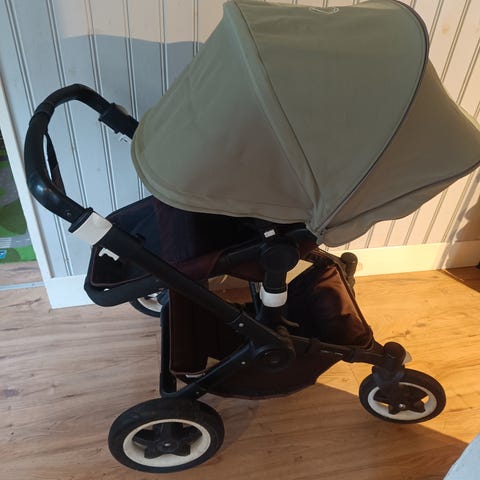 Äldre men fullt fungerande vagn med sitt och liggdel. 3 olika suffletter varav en sommar med ventilation. Orginal åkpåse. Fasta vinter hjul och svängande sommarhjul fram. Öppen för bud