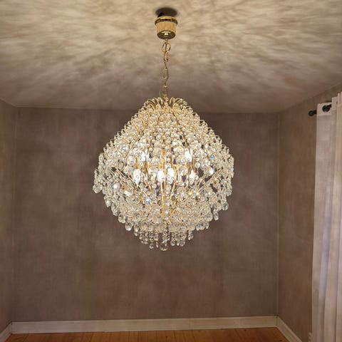 Kristallkrona taklampa med flera rader hängande prismor i glas.