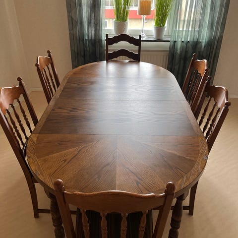 Matbord i trä med två utdragbara skivor. Bordet har rektangulär form med träskiva i brun nyans (Teak). Bredden är cirka 90 cm och längden är cirka 140 cm i grundutförande, med smidig möjlighet att förlänga till cirka 195 respektive 250 cm med en respektive två utdragbara skivor. Passar som matbord i kök eller matrum. Bordsskiva och ben är i trä. Stolarna på bilderna är också till salu. Stolarna är i trä, har grön stoppad sits och sadelgjord undertill.