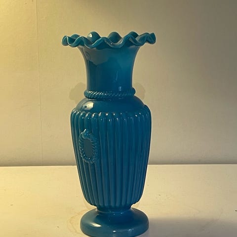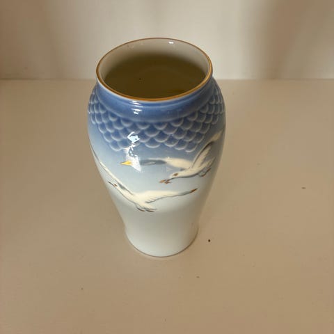 Fin vas från Wedgwood i klassisk blå jasperware med vita reliefmotiv. Tillverkad i England. Stämpel på undersidan: Wedgwood – Made in England – 75.