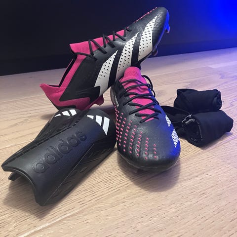 Adidas fotbollsskor i blå färg med mönstrade detaljer. Skorna är avsedda för fotbollsspel och har snörning framtill. Medföljer gör ett par Adidas benskydd i svart med vita ränder. Passar för användning vid träning och match på fotbollsplan.
