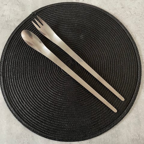 Fatet har en organisk, lövformad design med blankpolerad yta i rostfritt stål och löstagbar tyginsats i två färger, ljus och mörkgrå. Storlek ca 31x30 cm.