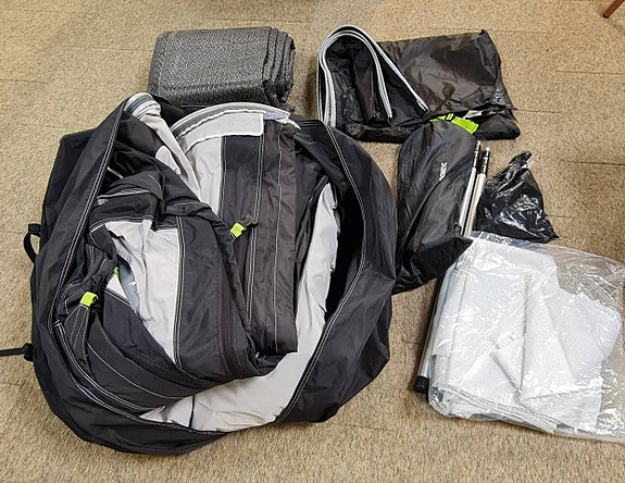 Tältduk, Stativ, Gardiner, Markkappa, Markpinnar o beslag, allt medföljer.