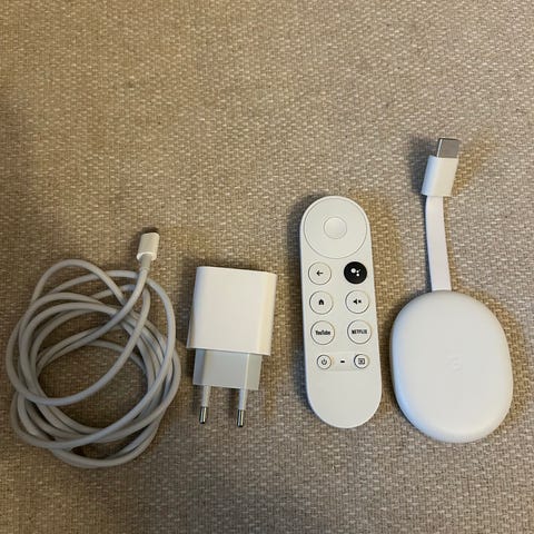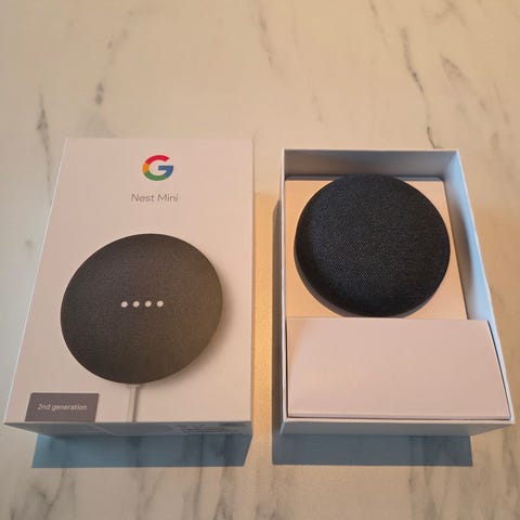 Google Nest Mini smart högtalare i grå färg. med vit nätadapter och strömkabel. Lämplig för röststyrning av musikuppspelning och anslutna smarta hem-enheter via kompatibla tjänster och system.