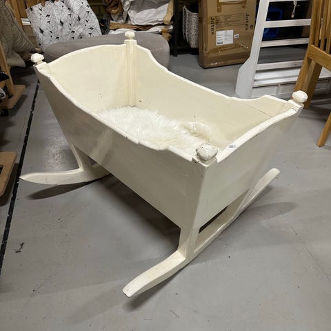 Hemmagjord vit vagga i trä för baby. Vaggan står på medar som gör att den kan gungas lätt fram och tillbaka. Den har höga sidor och rundade kanter. Madrass i ljus färg ingår, anpassad till vaggans storlek. Passar som sovplats för spädbarn inomhus. Placeras direkt på golv i barnrum, vardagsrum eller sovrum.