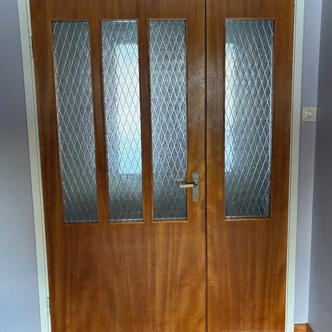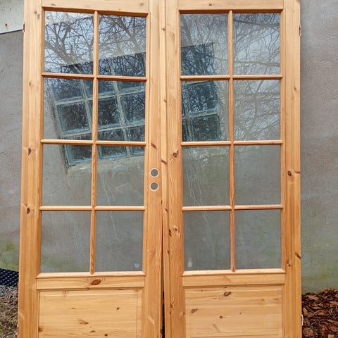 Fina pardörrar(innerdörrar) i ek med glaspartier samt karm(vitmålad) utan tröskel. Handtag, lås och nyckel medföljer. Dörrarna är i original från husbyggnation i slutet på 60-talet.