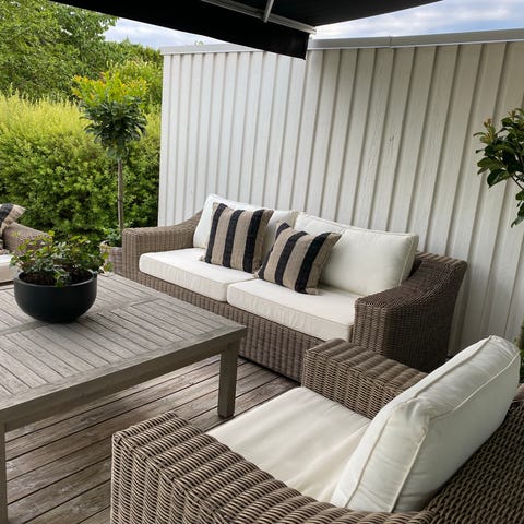 Helt nytt Platinum Challenger parasoll, limited edition med teak aluminium, antracit detaljer och Spuncrylic duk i Champagne färg. 300x300. Parasollet är fristående med sidostolpe och rektangulär skärm. Konstruktion med kraftig aluminium stolpe. T2 (tilt 2) vilket innebär tilt bakåt och åt sidorna. Höjd ca 265 cm och utfall ca 198 cm enligt skiss. Passar för uteplats, altan eller trädgård där man vill skapa skugga över sittgrupp eller lounge möbler. Nypris 10.999 SEK. En fot på minst 90 kg rekommenderas till detta parasoll.