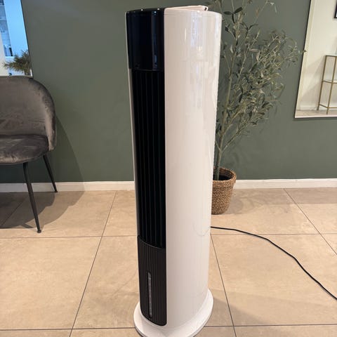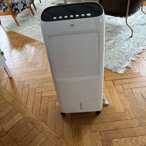 Portabel luftkylare i vit färg med hjul för enkel förflyttning. Enheten har vertikalt galler framtill, kontrollpanel upptill samt vattenbehållare i nederdelen. Baksidan är utrustad med filter och luftintag. Passar för användning inomhus för att kyla och cirkulera luft i rum.