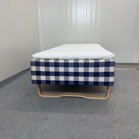 Hästens Superia säng med klassiskt blåvitt rutigt tyg. Sängen står på runda träben och har en överdel med ljus bäddyta. Modellen är en ramsäng/kontinentalsängsdel som kan användas fristående eller tillsammans med en andra del för att bilda en dubbelsäng. Passar i sovrum där man önskar en säng med Hästens karakteristiska rutmönster och träben.