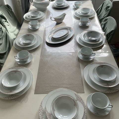 Svart servis porslin med tallrikar och muggar
